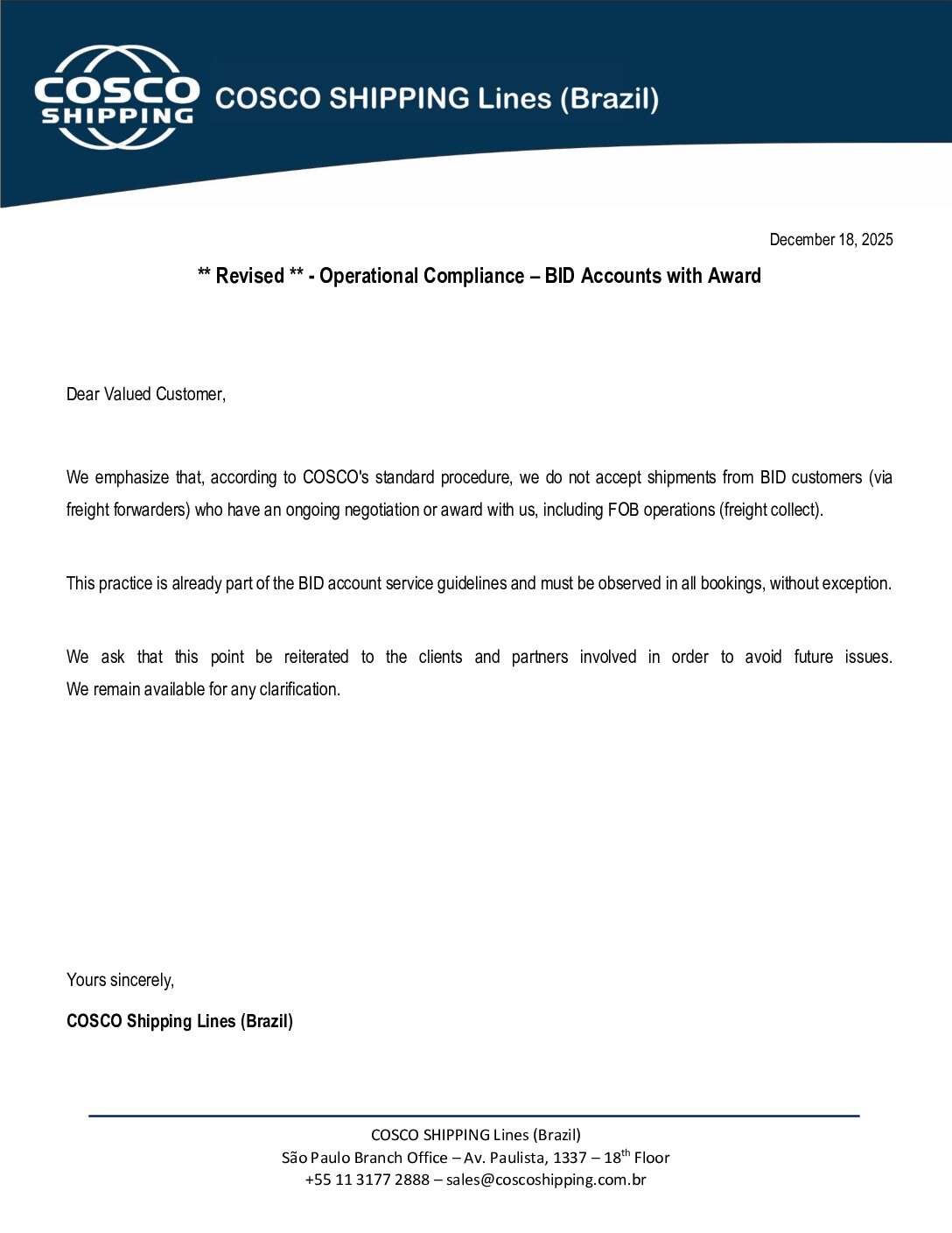 Notice – Middle East Update – Customer Advisory No1 – COSCO Shipping Lines Brasil