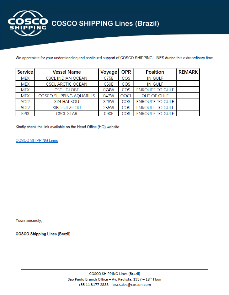 Notice – Middle East Update – Customer Advisory No2 – COSCO Shipping Lines Brasil