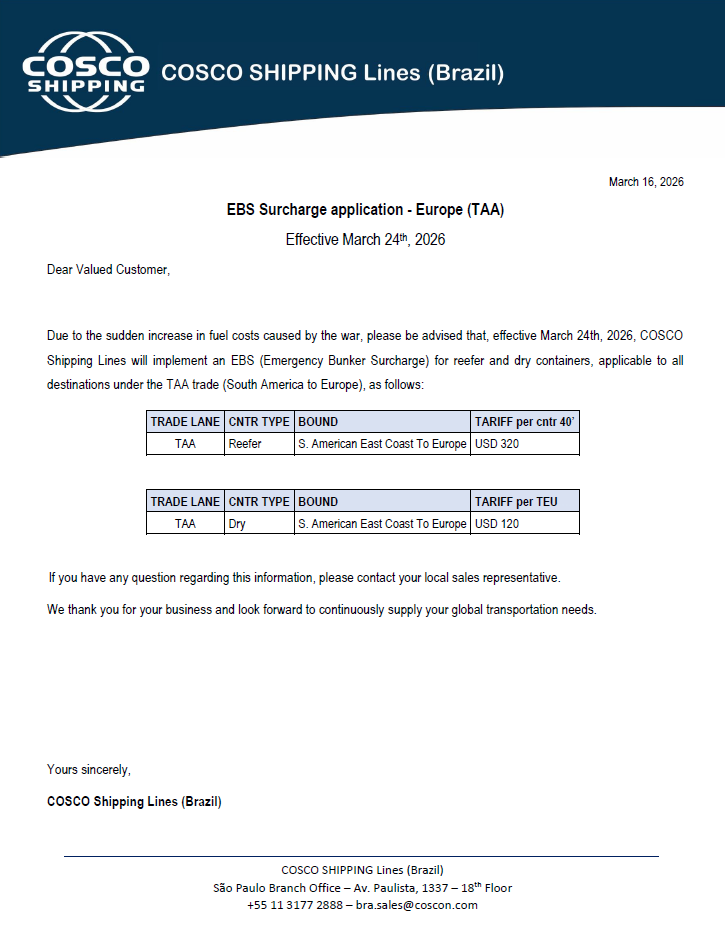 Notice – EBS Surcharge application – Europe – March 24th 2026 – COSCO Shipping Lines Brazil