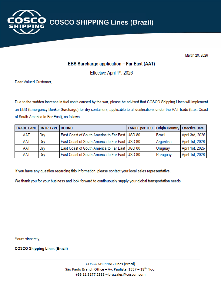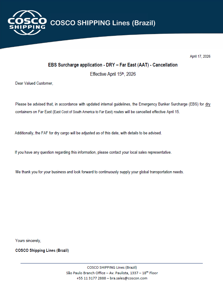 Notice – EBS Surcharge application – DRY – Far East (AAT) – Cancellation – COSCO Shipping Lines Brazil