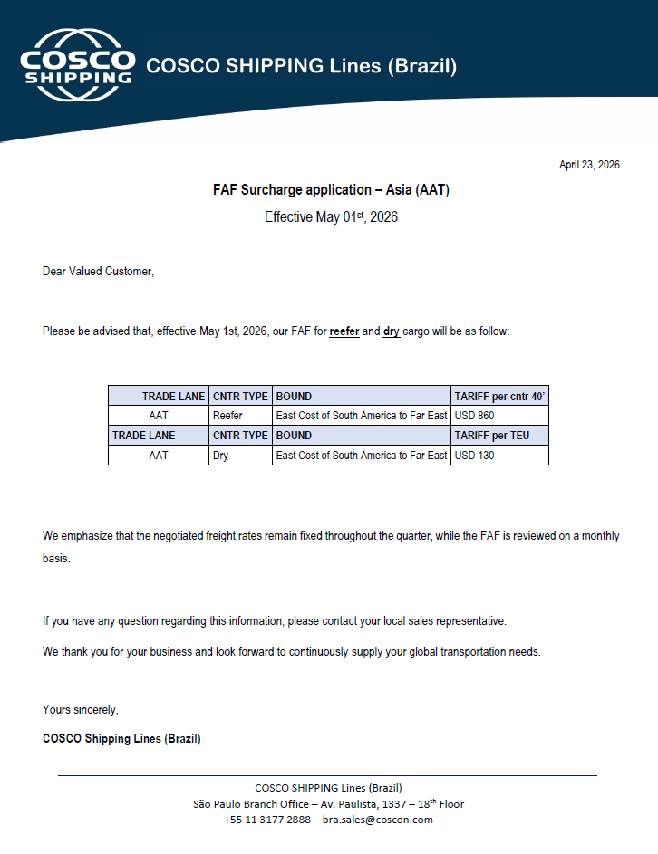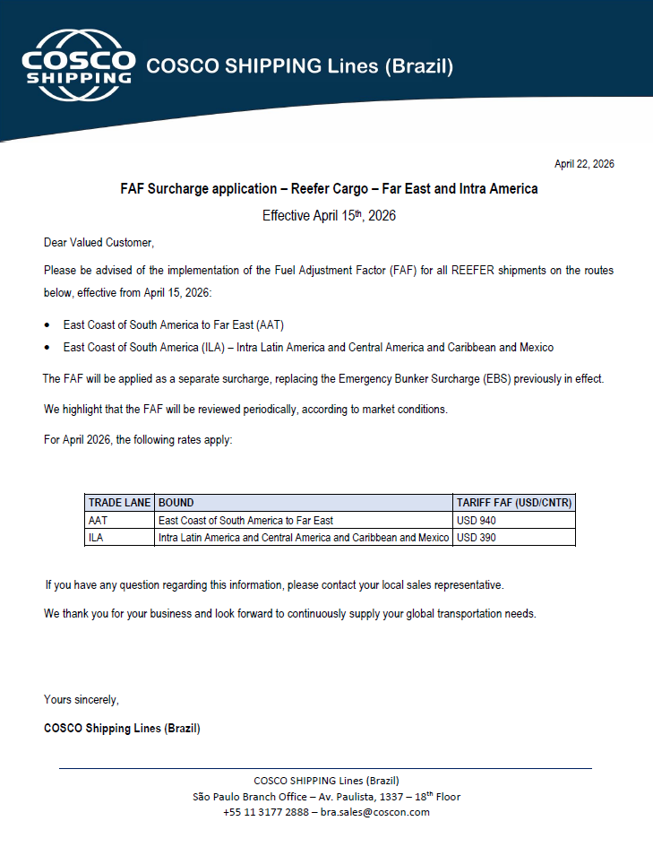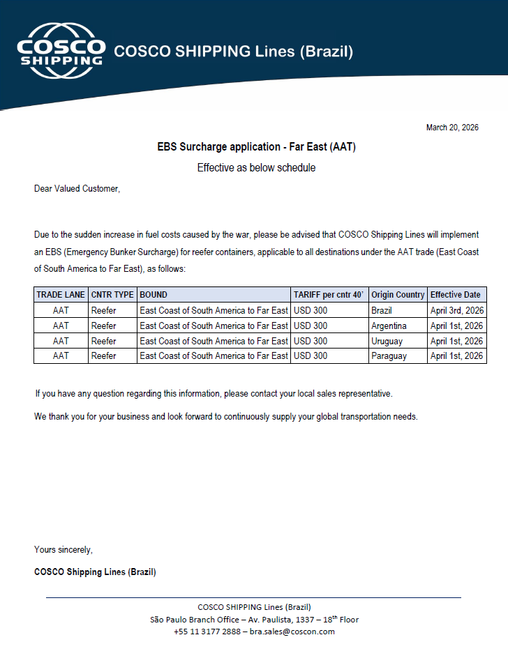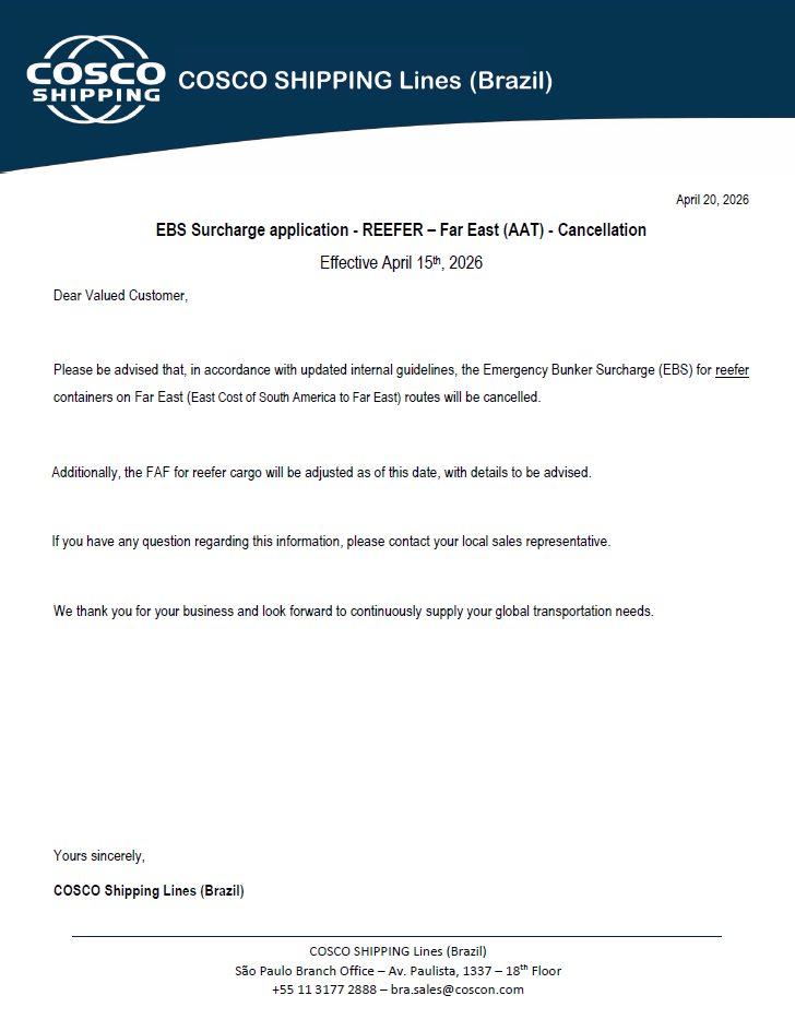 Notice – EBS Surcharge application – REEFER – Far East (AAT) – Cancellation – COSCO Shipping Lines Brazil