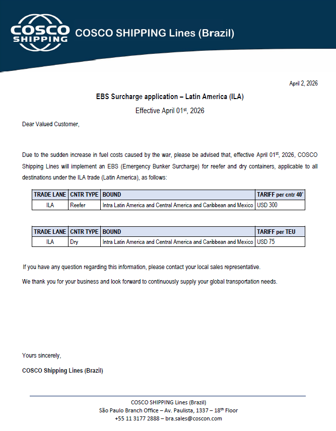Notice – EBS Surcharge application – Latin America – COSCO Shipping Lines Brazil