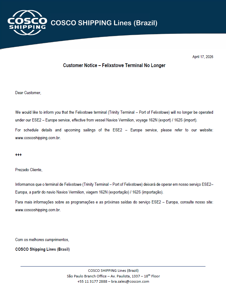 Comunicado – Transferência de terminal London Gateway para Felixstowe – Maio 14_2025 – COSCO Shipping Lines Brasil