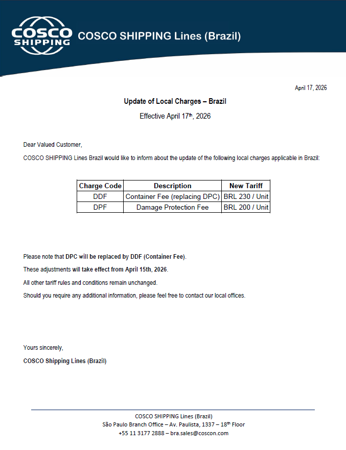 Notice – Update of Local Charges – DDF – DPF – COSCO Shipping Lines Brasil